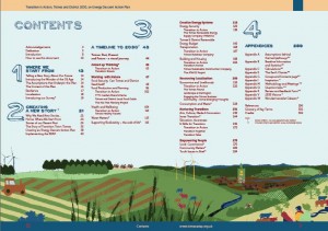 Also created at this stage were a set of ‘Resilience Indicators’ for each of the subject areas. Projects already underway in Totnes that had emerged from TTT were also gathered together as ‘Transition in Action’, to show that this process had already begun. Step 7 was a lot of work, and Jacqi deserves the Nobel Prize for Transition for the incredible editing job that led to the final document, and thanks are also due to LumpyLemon who did such a beautiful design job on the final document (as you can see in these images).