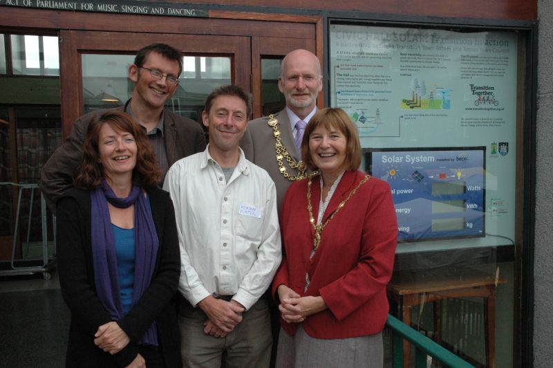 With the new display and monitor outside the Civic Hall (left to right) Fiona Ward (Transition Streets), Rob Hopkins, Adrian Porter (Transition Streets), Cllr Tony Whitty (Totnes Mayor), Carole Whitty (Lady Mayor).