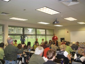 After a couple of years of occasional conversations by people in the North West about the possibilities of a regional gathering, a small group of people came together in Seattle to make it happen. With Leo Brodie taking the lead, two months of intense organizing started. In mid-September in South Seattle the annual NW Permaculture Convergence was taking place. Leo contacted the venue where that was taking place, South West Community College, to ask if a day long conference could be held on the day prior to the start of the convergence. Not only was the answer “yes”, but we were gifted with no charge for the venue. Chris Wolfe from Transition Whatcom County took the plunge and offered to prepare three meals for the day. Chris had never cooked for so many people and took to the challenge with enthusiasm and love which spoke so much to what the day was about. Chris was helped in the kitchen by ten year old Keegan who was attending the event with his dad. Meanwhile online lively discussions took place looking at the format of the day. The final order of events included four panel discussions, an Open Space session and a final discussion as to “what next?”.